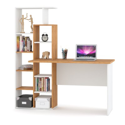 Компьютерный стол, комбинированный с открытой стеллажной системой, позволяет создать удобное и функциональное рабочее место на минимальной площади. На широкой прямой столешнице комфортно помещается ноутбук или планшет; при необходимости за столом можно работать с бумажными документами. Стеллаж заполняется книгами, учебниками, компьютерными принадлежностями, сувенирами. Простые формы оживляются контрастным сочетанием декоров – белый цвет и имитация натурального дерева. Модель предназначена для современных интерьеров.