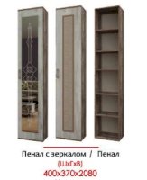 Пенал представлен в двух исполнениях – со вставками из эко кожи и с зеркалом (зеркало с пескоструйной обработкой). В центральной секции верхние створки устроены по принципу купе.