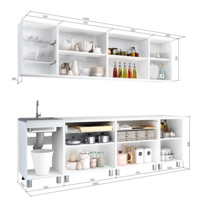 Нижний ряд: шкаф-стол с одним ящиком 500 мм, двухдверный шкаф-стол с одним ящиком 700 мм (2 штуки), шкаф-стол под мойку 500 мм
