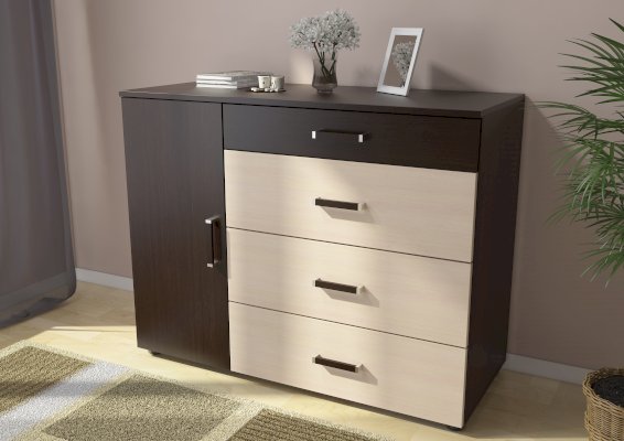 Модификация комода Вега К-02 отличается расширенным функционалом. В конструкцию комода была добавлена закрытая секция с полкой, которая делит секцию на два отсека для хранения вещей.