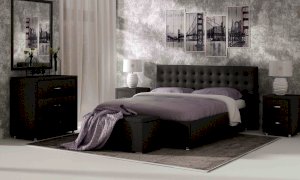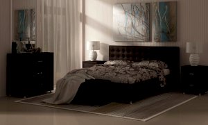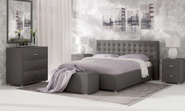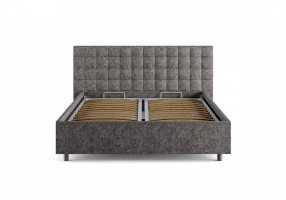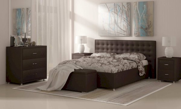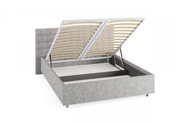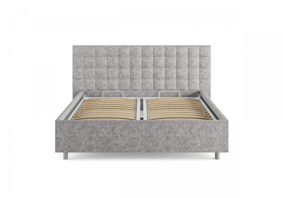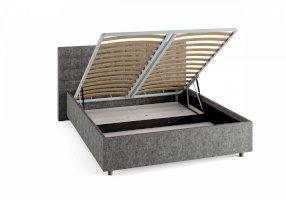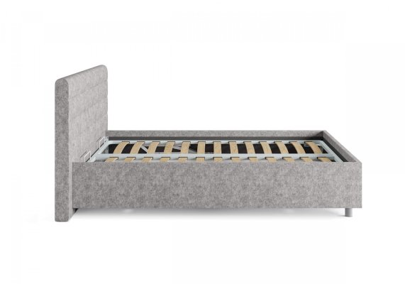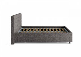 Современная и стильная интерьерная кровать. Модель изготовлена из ДСП и ДВП. В комплект кровати входит кроватное основание. Каркас основания выполнен из металла, ламели - из берёзы. При необходимости в комплект можно включить подъемный механизм с бельевым ящиком, который существенно увеличит объем хранения вещей, а так же позволит легко производить уборку пыли под кроватью.