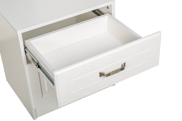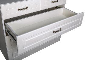 Фурнитура: Распашные фасады на четырёхшарнирных петлях, выдвижные ящики на шариковых направляющих полного выдвижения.